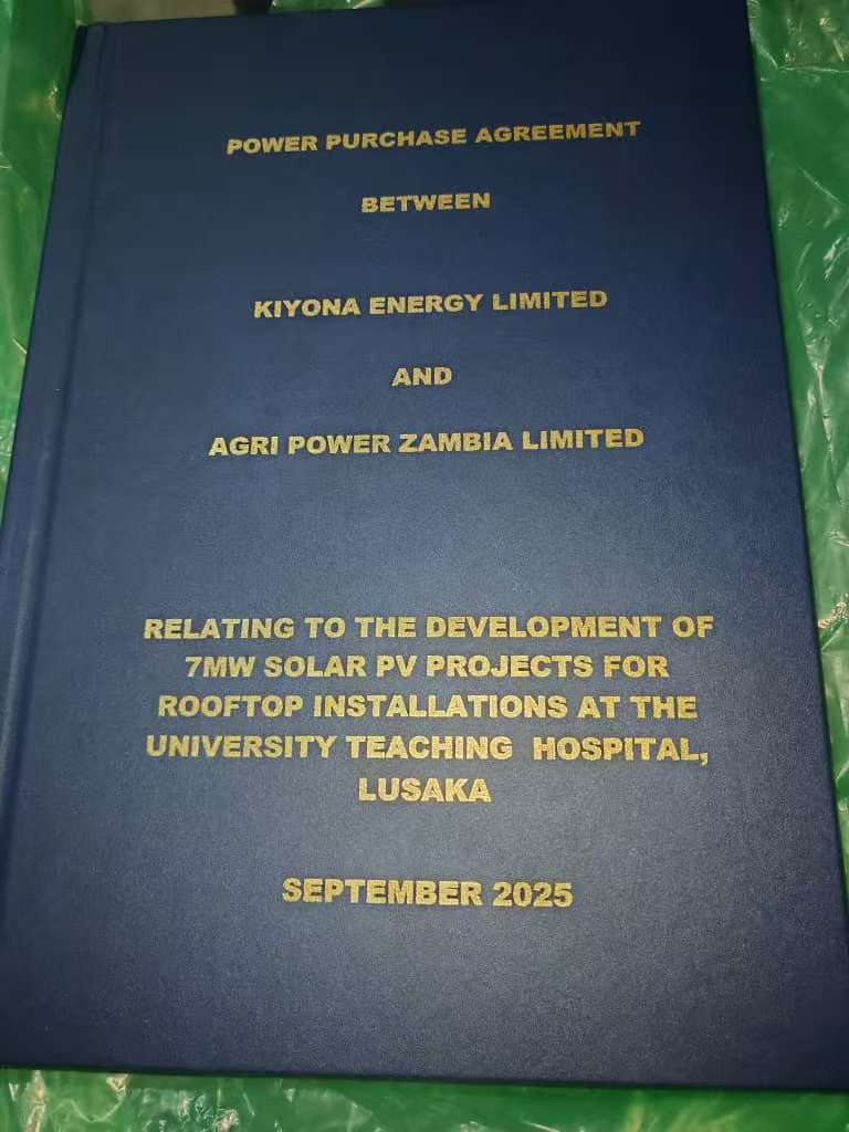 LUSAKA, [Sep 20,2025] –AgriPower Zambia Limited 欣然宣布,已与 Kiyona Energy Limited 成功签署了一份购电协议。 签约仪式在卢萨卡举行,上海睿珀机电的代表 Roger Tembo 先生和 Kiyona Energy Limited 的首席执行官 Siame Clement 先生共同出席了仪式。